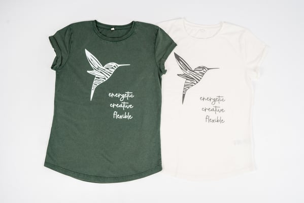 Der Kolibri steht für Vata - Kreativität, Leichtigkeit und Flexibilität. Die hochwertigen Damen Shirts sind von Earth Positive, aus Biobaumwolle und tailliert geschnitten. Die Größe fällt normal aus. Erhältlich in Stone Wash White und Stone Wash Green.